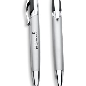 A unique design from our SILVER range. a silver clip with rubberised trim Barrel: aluminium with satin lacquered coating clip & tip: polished chrome trim: rubberised ABS with black German ink